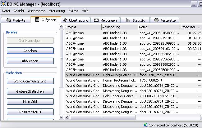 Der Rechenaugust ist mein persönlicher "Kellerserver", und wie der Name schon sagt, steht das Teil (z.Zt. ein Linux_x86_64-Server; 64 CPU, 128 GB RAM) bei mir im Keller. Obwohl die Maschine die NFS/Samba - Freigaben, den Mailserver, das CVS-Repository, Apache, Tomcat, usw... beherbergt ist natürlich trotzdem noch "etwas" Kapazität übrig. Daher die Idee diese Kapazität sinnvoll zur Verfügung zu stellen. Aber wie? Nun, als einen kleinen Anfang, kann man die Suche nach Aliens ansehen (seti@home); es gibt aber noch diverse andere Projekte wie PrimeGrid mit der Suche nach "neuen", extrem grossen Primzahlen. Dies alles, und viele weitere Projekte, läuft heute unter dem BOINC-Client (Berkeley Open Infrastructure for Network Computing). Mit dem BOINC-Manager (s.rechts) kann alles verwaltet werden. Da dieser Server unter Linux (OpenSuse Tumbleweed) läuft, und dafür oftmals keine aktuelle Boinc-Software (Client u, Manager) zu bekommen ist, habe ich mich daran gemacht sie aus den bei Berkeley verfügbaren Quellen selbst zu kompilieren. Daher ist die jeweils aktuelle Linux 64 (u. 32) bit Boinc-Software hier zu haben. Das Bild rechts zeigt übrigens einen Urahnen des aktuellen Systems, aus einer Zeit als Doppel-Prozessormaschinen (nicht zu verwechseln mit Dual-Cores!) noch etwas besonderes im privaten Bereich waren. Zukünftig ist auch vorstellbar, dass Anfragen an diesen Server gestellt werden, z.B. nach Kettenbruchentwicklungen, "Lucky Numbers", graphischen Darstellungen von Funktionen, etc. Vorschläge (bitte realisierbar!) sind gerne willkommen. | ![]() ![]() |